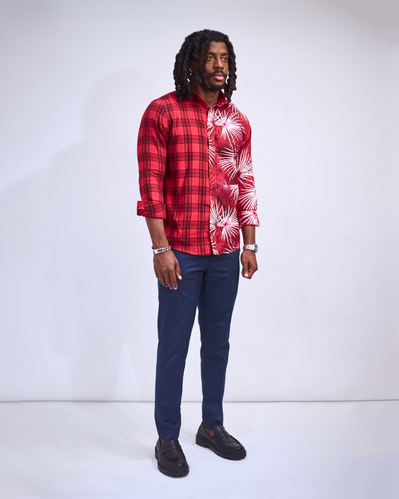 Inspired by the rhythm of the Savanna and the elegance of Savile Row tailoring, this shirt celebrates duality through bold design and impeccable craftsmanship. Half red-and-black tartan plaid, half Afrocentric fauna pattern, it’s a statement piece that bridges continents in one sophisticated silhouette. Smart casual to elevated evening or cultural events.